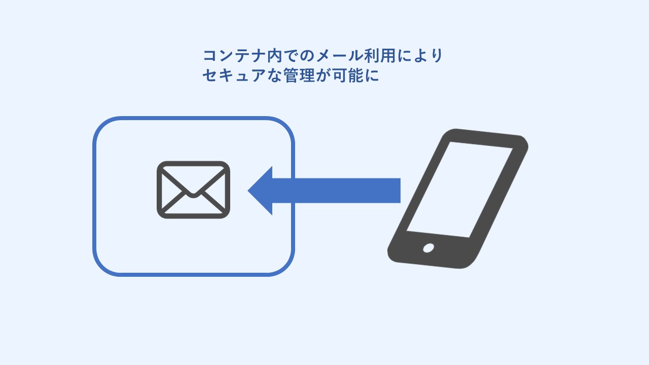 セキュリティが確保された専用領域(コンテナ)内でのメール閲覧、送受信を行うことで、機密情報がだ多く含まれるメールのセキュアな運用が可能に。